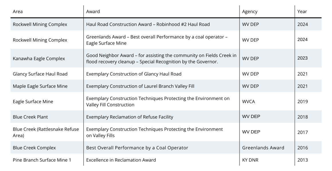 Our goal is to create a new multifunctional landscape that benefits the future needs of the region once our operations are complete. Since 2017, our land reclamation work has resulted in the release of approximately $148 million in bonds which we believe to be the most of any mining operation in the eastern U.S. Also, as a part of reclamation activities we have planted more than 500,000 trees since 2021. Our reclamation work is predicated on rigorous environmental testing, establishing vegetation, clean water sources, and sloping and grading land to create a practical and functioning post mining land use for property owners and the community. We are proud to be recognized as a reliable steward of the land and have received multiple awards for our diligence in reclamation.